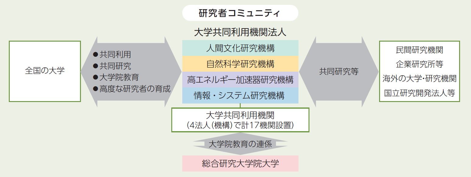 大学共同利用機関は、「研究者コミュニティによって運営される研究機関」であり、各大学の枠を越え、全国の大学等の研究者に共同利用・共同研究の場を提供する中核拠点、国際的な頭脳循環のハブ、ならびに異分野融合・新分野創成を推進する役割を果たすとともに、各機関の特性を踏まえた機能強化に努めています。